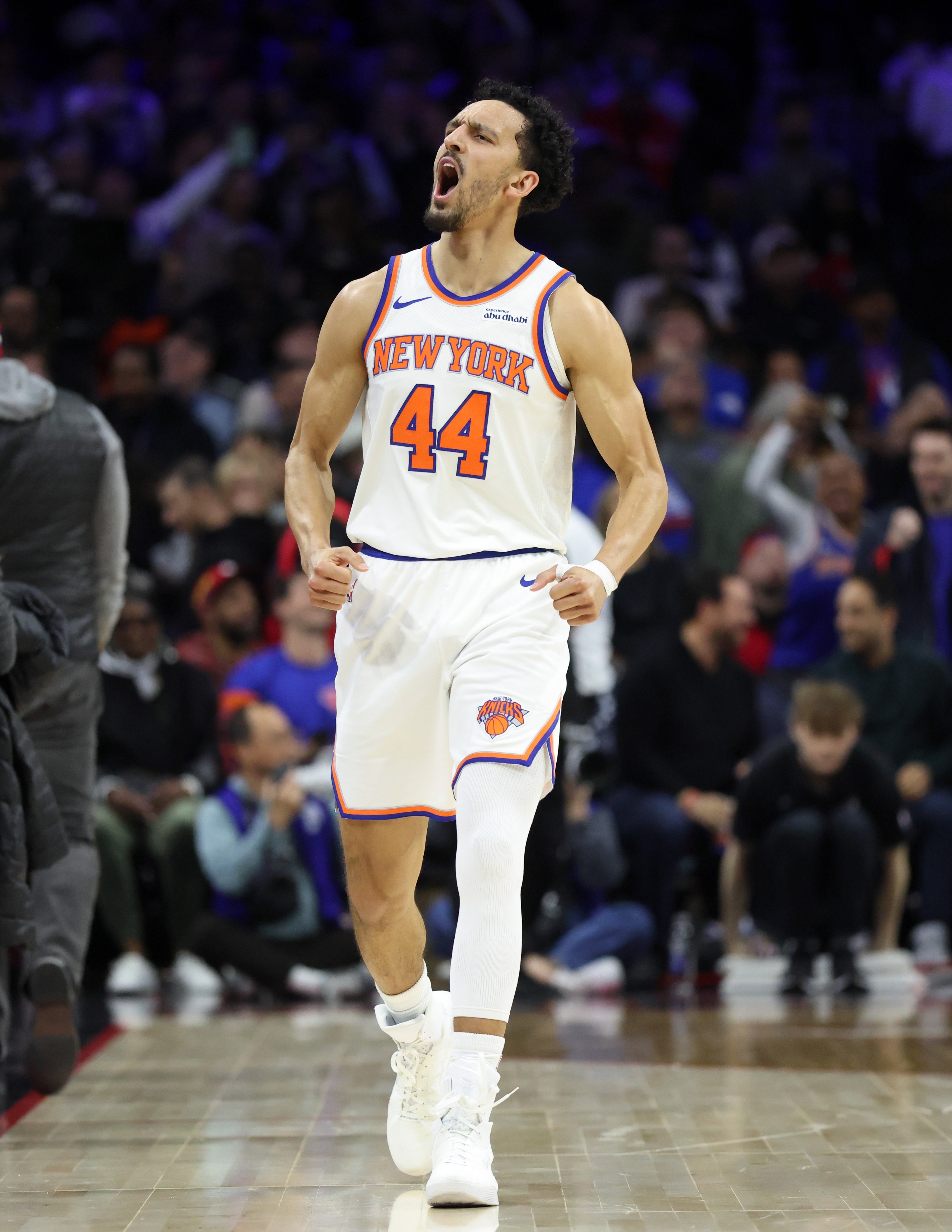 尼克斯在布伦森和唐斯两个主动点都被限制的情况下,非常依赖突分转移球找弱侧空位三分,阿努诺比、沙梅特、科勒克上半场合计6记空位定点三分撑起了输出火力