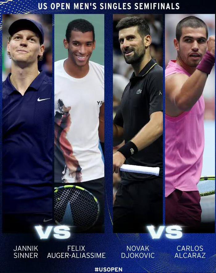 男子方面,辛纳、阿卡和德约挺进四强,自然是众望所归,而唯一剩余的一席,在前赛会亚军、世界第三兹维列夫被淘汰后,其所在的四分之二区成为开放区。原本被认为最有可能出现在四强的卢布列夫和德米纳尔,却双双在这场竞争中出局,无缘创造个人大满贯最佳成绩,最终挺进四强的是阿利亚西姆。