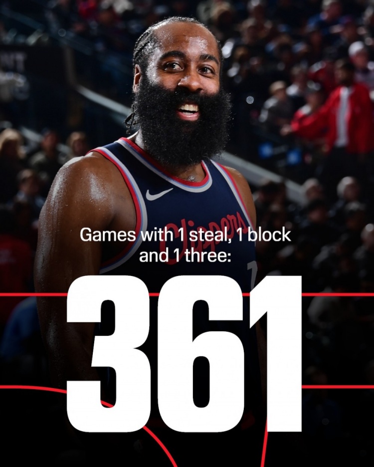 8月13日,ESPN公布了一项NBA历史特殊数据统计。联盟历史上仅有三名球员达成过350场以上常规赛单场贡献1盖帽+1抢断+1三分的表现,分别是:勒布朗·詹姆斯(464场)、凯文·杜兰特(397场)和詹姆斯·哈登(361场)。